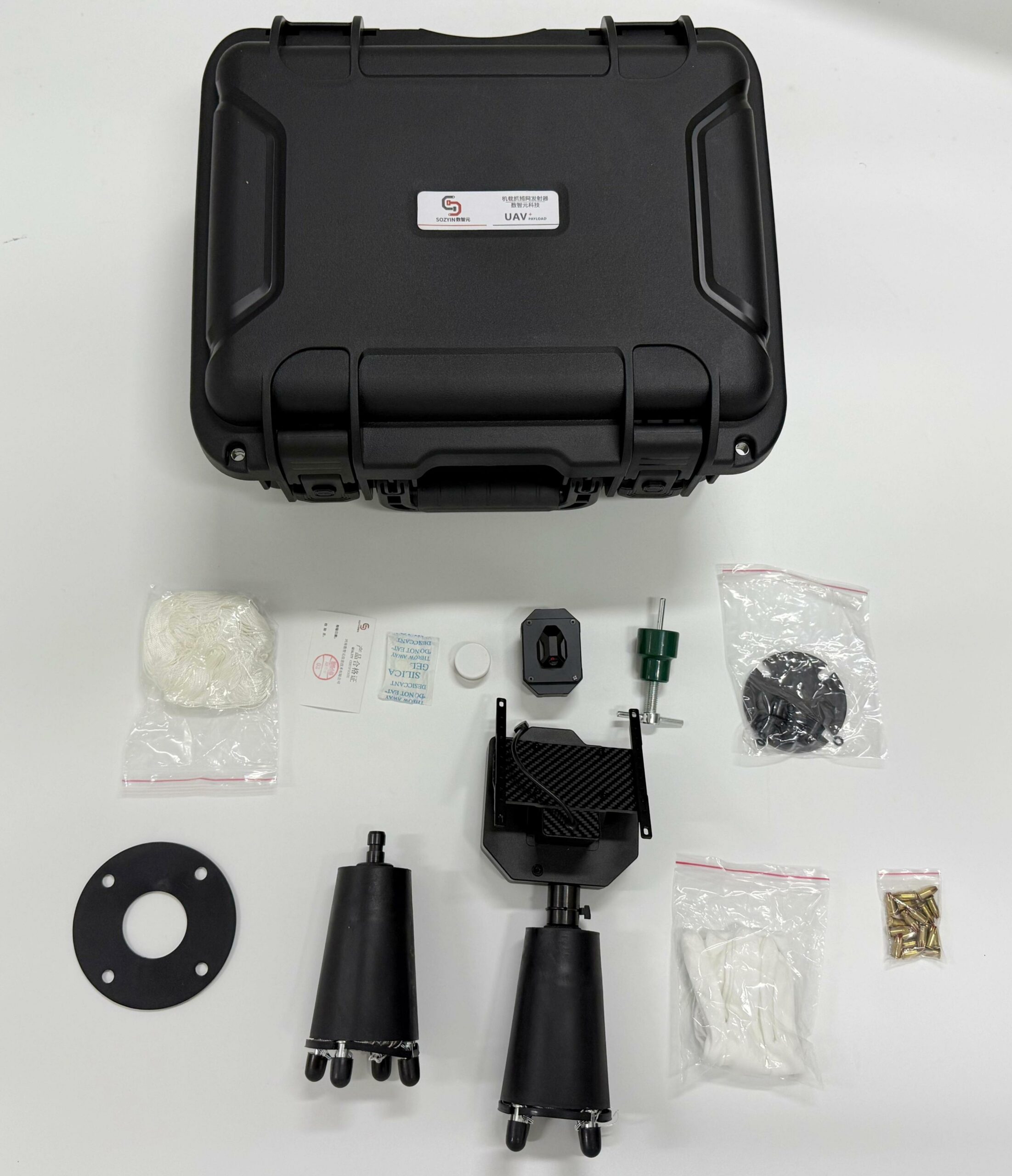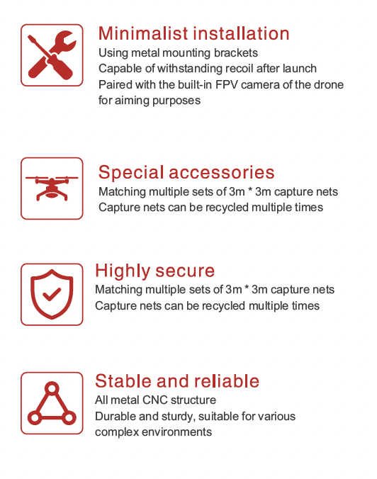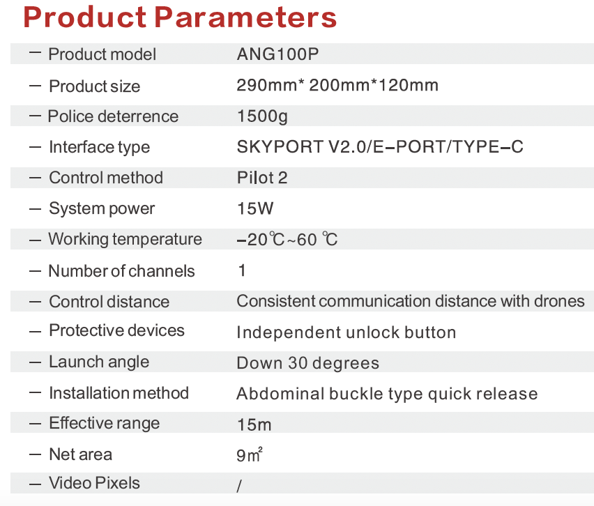 ANG100P is a drone capture net launcher, that can fire a 9-square-meter net in the air with an effective range of 15 meters. It seamlessly connects to the drone via PHUB, and the aiming is done through the camera. The control distance is the same as that of the drone remote controller. It is suitable for public security and armed police capture operations as well as wildlife rescue.